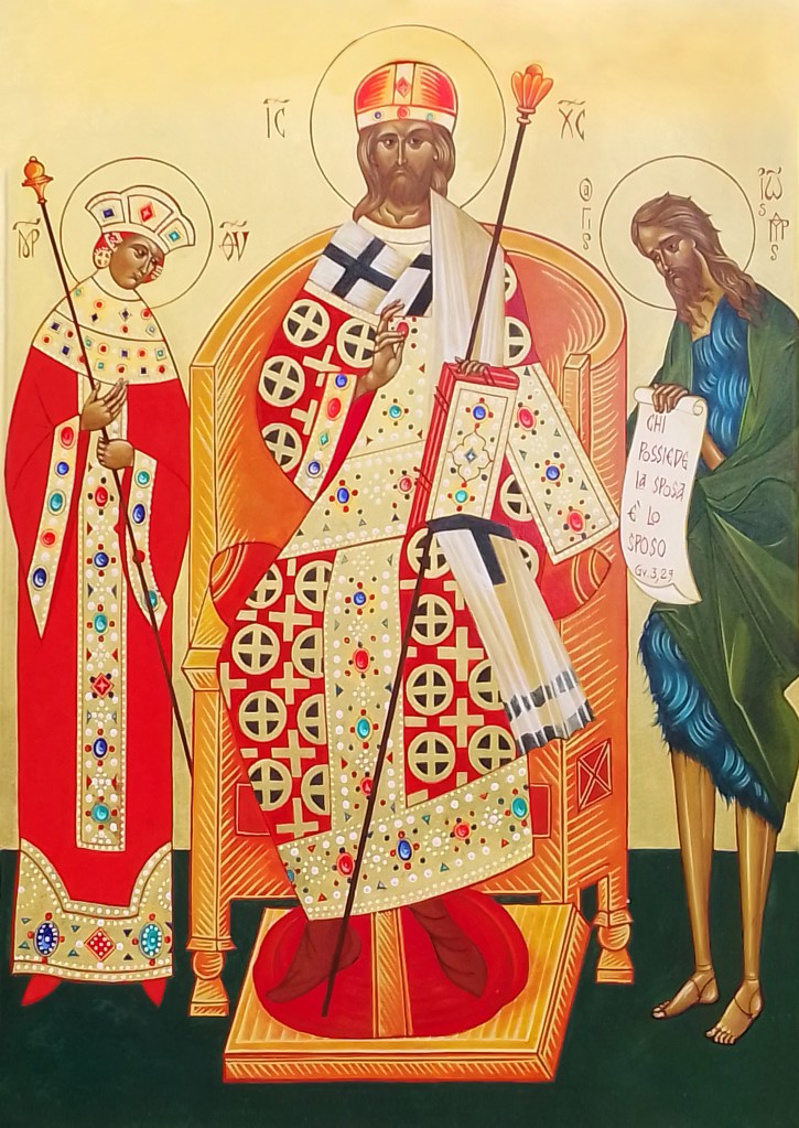 “Iconografia”: Cristo Sacerdote e Re, Maria in abiti regali; Giovanni Battista con cartiglio.
